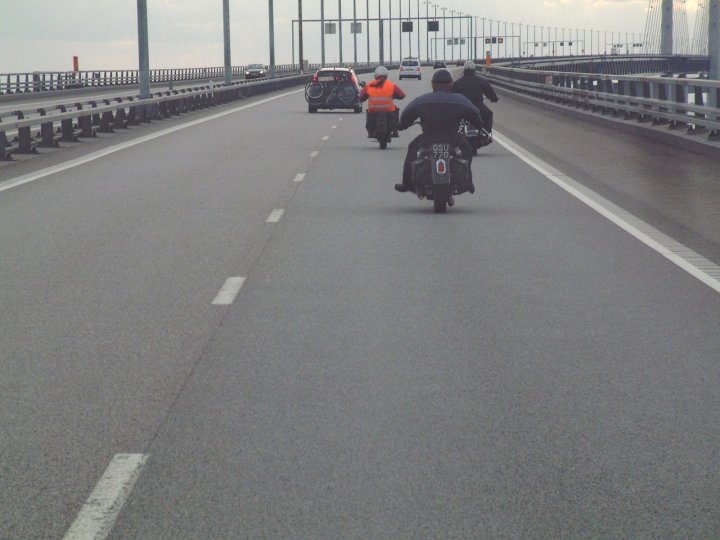 we arrive at the Oresund Bridge in sunshine. Tony motors ahead, where he