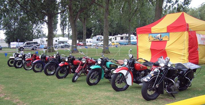 line up on the Indian club stand, 9 Indians & 1 Harley
