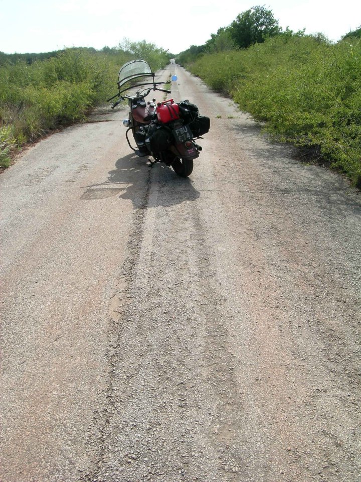 tumble-weed still blows across the unmarked dirt road ahead of the bike.